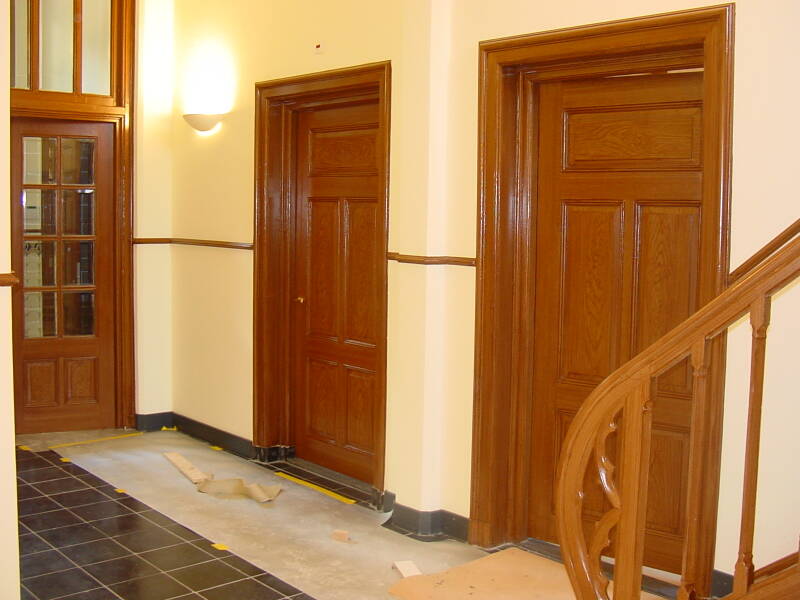 Hier zijn verschillende toepassingen van houtimitaties waaronder het aanpassen van dekkend geschilderde balken in de oorspronkelijke houtimitatie en het maken van een imitatie naar voorbeeld van bestaande deuren.